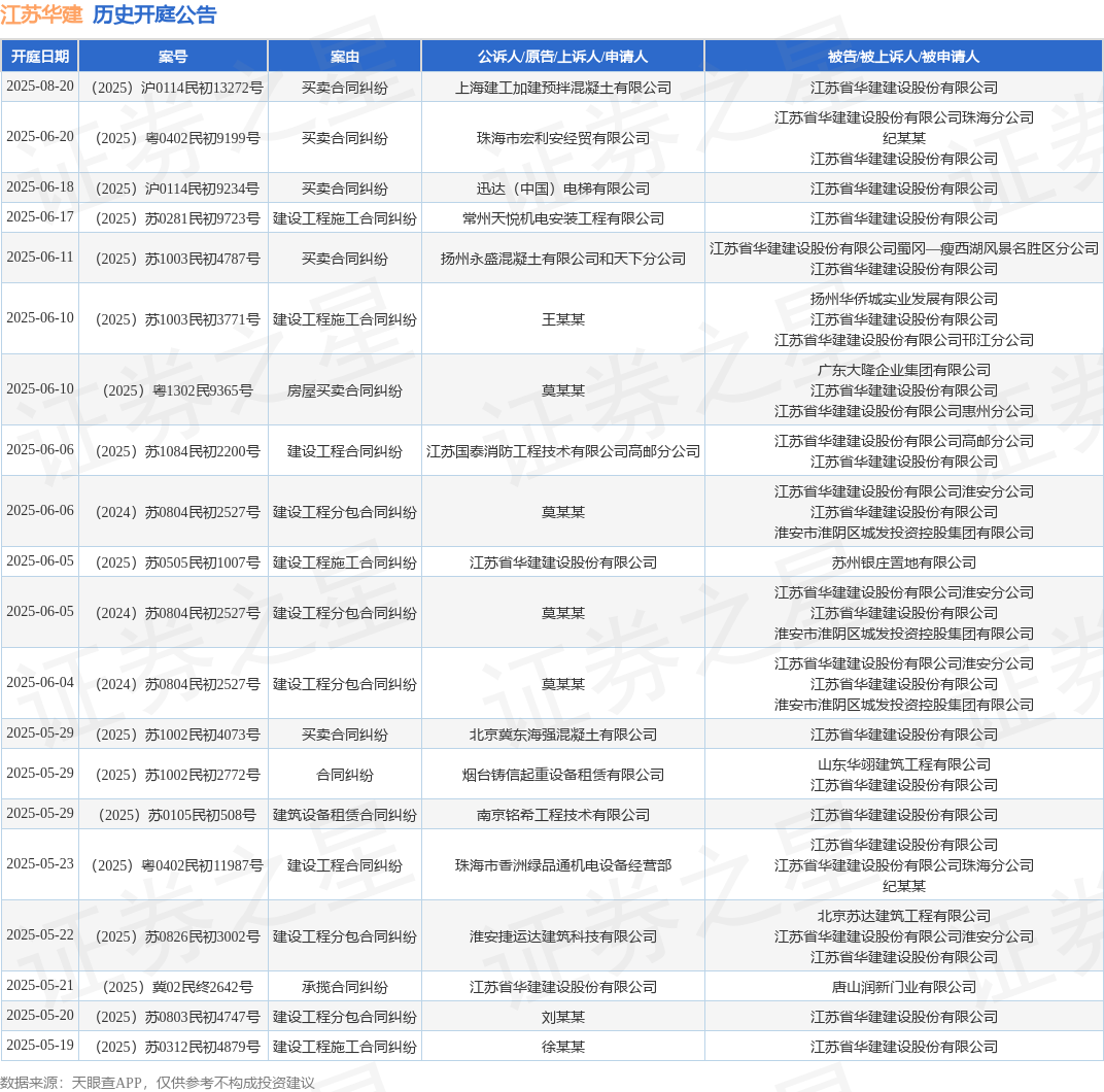 本站消息,根据天眼查APP显示,近日公布了一则江苏省华建建设股份有限公司作为被告/被上诉人的开庭公告,详细内容如下: